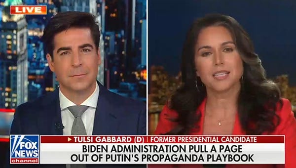 OK we're going to stop for a moment because this is one of those Fox News quotes that sounds like it might be about something. But this is Fox News, which has been doing little besides giving a platform to Russian propaganda since Vladimir Putin started murdering babies in Ukraine, and this is Tulsi Gabbard, who takes over as Russia's Next Top Useful Idiot if for some reason Tucker Carlson is unable to fulfill his duties. They haven't earned the right to our benefit of the doubt, or even our assumption that they didn't have to first translate these talking points out of Russian in order to say them on TV.