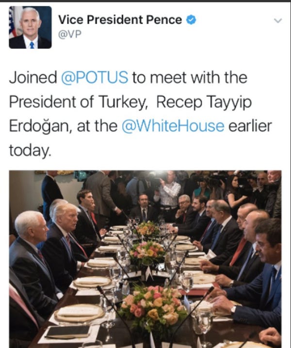 The State Department summoned the Turkish Ambassador to let him know "in the strongest possible terms" that it is considered uncouth to kick the shit out of protesters in America, except when it is not; there has been no statement from President Donald Trump, who warmly congratulated Erdogan for his recent electoral "win" and whose disgraced former national security adviser, Mike Flynn, was fired after news was leaked that he had taken $600,000 from Turkey while receiving national security briefings; who plotted to kidnap a Turkish cleric from his American home on behalf of Erdogan; and who nixed a plan for a military raid on ISIS that would have gone against Turkey's policy wishes.