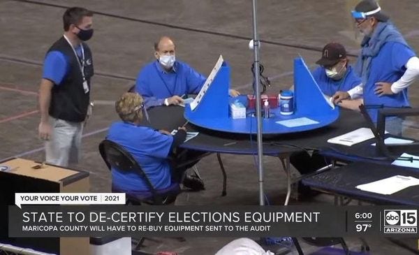 But instead of copping to wasting months and months and millions and millions of dollars, Fann and Logan announced that they'd confirmed the original count, hoping to salvage their credibility and export the exercise to other states. Also, they fought like hell and are currently defying a court order to turn over their records, all while hinting darkly at a Democratic conspiracy because Maricopa County refuses to expose its entire network to hackers by handing their routers to the dipshit Ninjas.