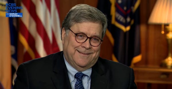 Hey, remember that time Loretta Lynch recused herself from the Hillary Clinton email investigation — an investigation which Barr just tapped out on in October of 2019 — after having a brief discussion about her grandkids on the tarmac with Bill Clinton? Remember how Republicans spent the last three years pretending that their chat proved that the FBI was totally BIASSSS, and thus it was UNLEGAL to investigate the Trump campaign's bumbling attempts to coordinate with Russian hackers to steal the election?