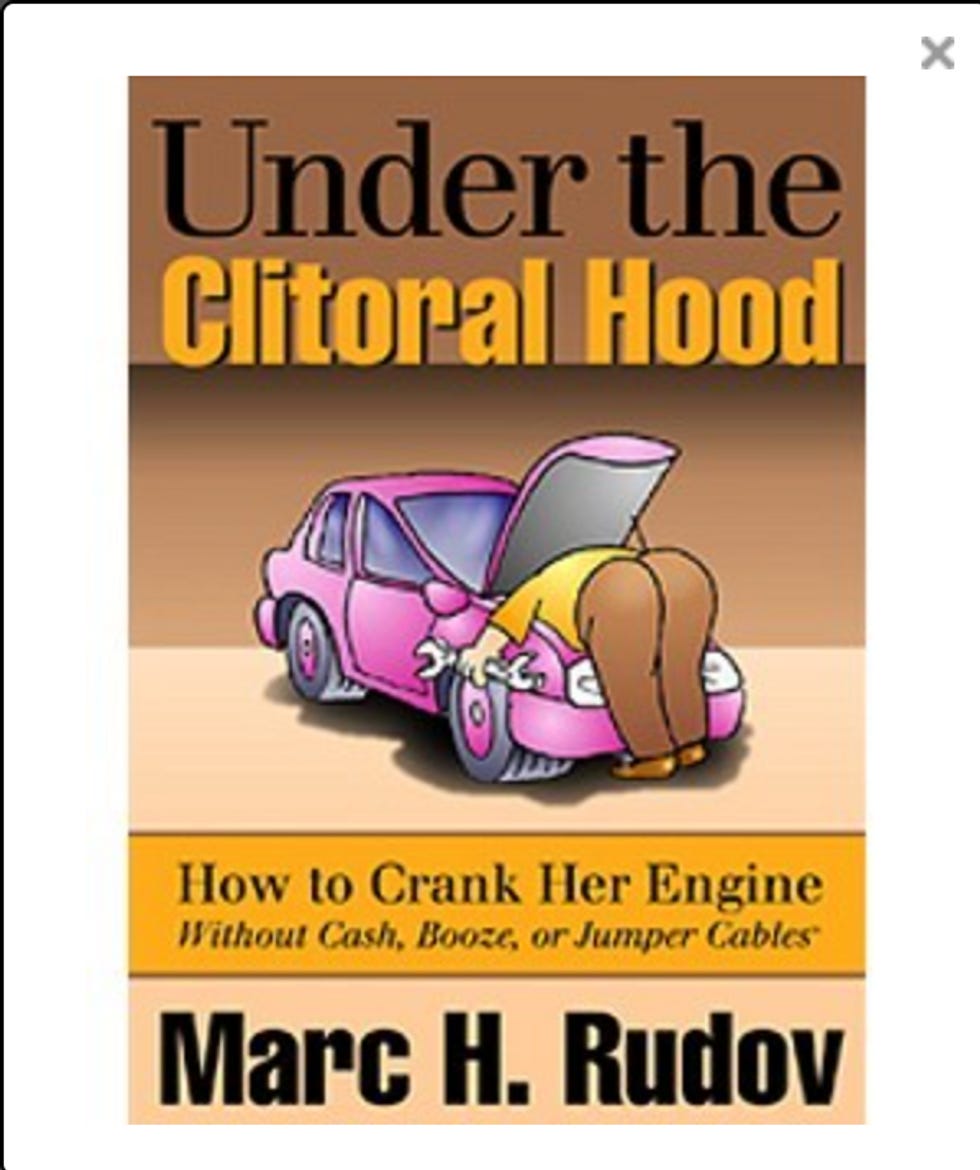 Amazingly enough, one of his other self-published books seems even worse, as it is titled (and I am so sorry to do this to you) Under the Clitoral Hood: How to Crank Her Engine Without Cash, Booze, or Jumper Cables .