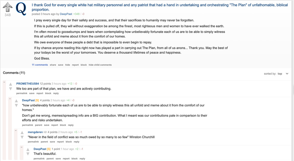 Some are thrilled to celebrate the imagined current contributions of "white hat military personnel" to their cause, but also quick to celebrate their own sacrifices as "digital soldiers."