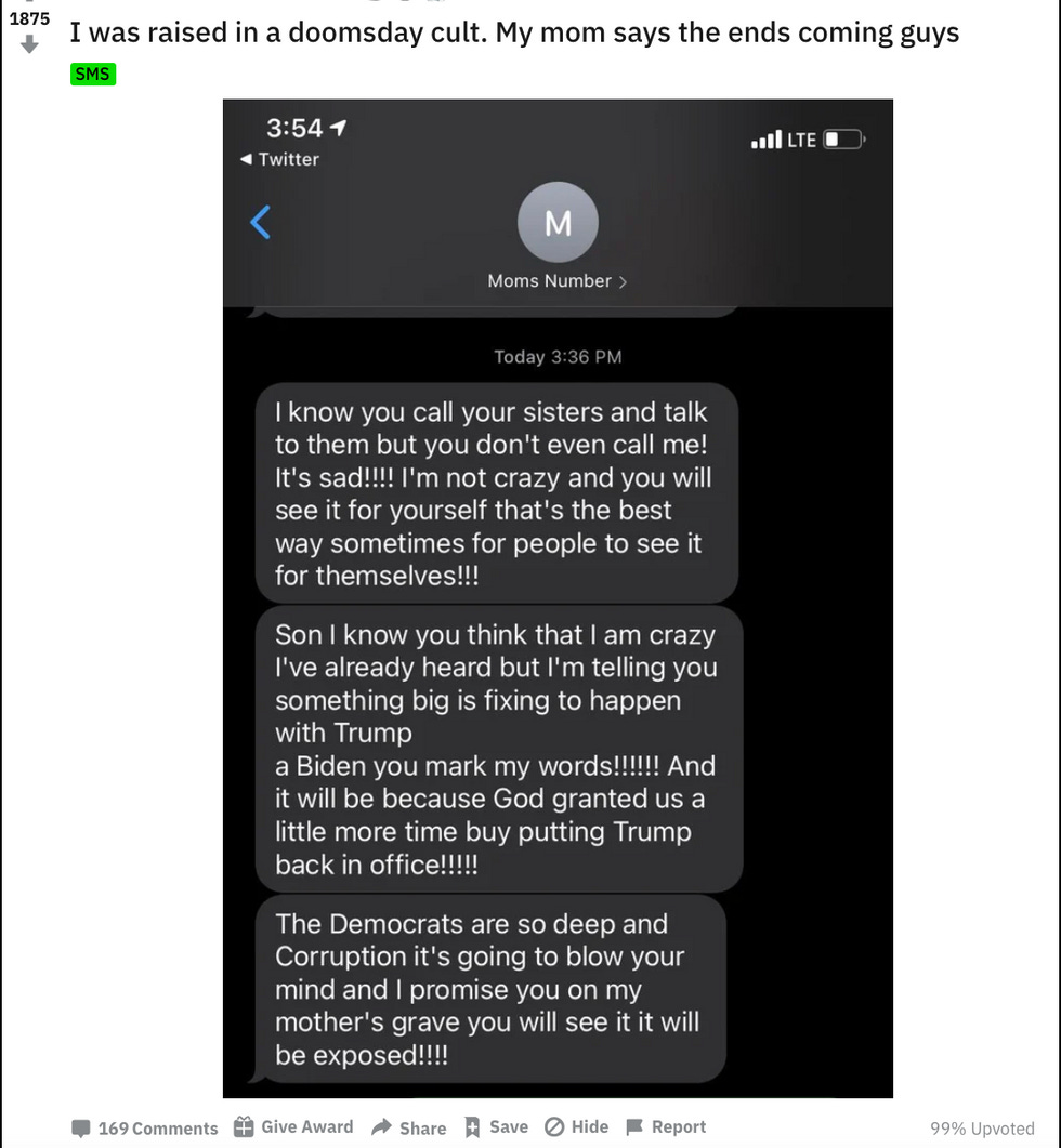 Since QAnon has mostly been purged from social media, some adherents have started communicating through text messages, which has not been pleasant for their family members. On Reddit, people are reporting getting strange messages from their conservative parents talking about how something big is coming in the next few days.