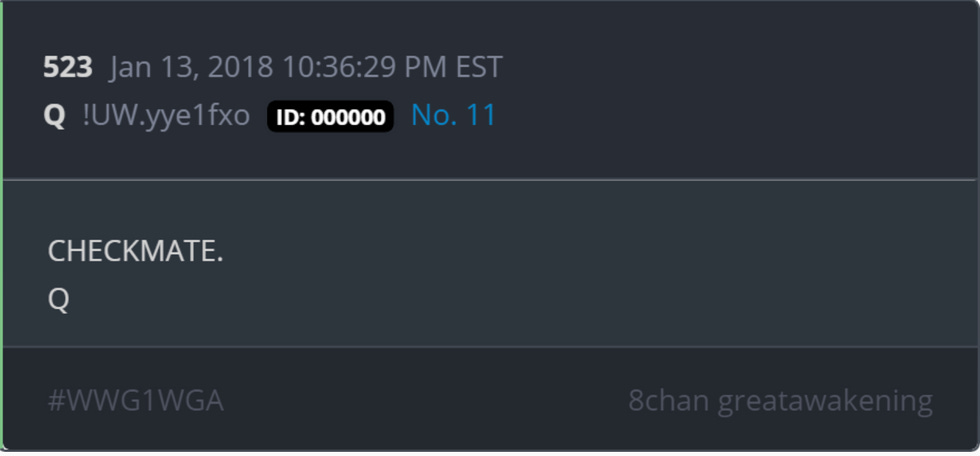 The prevailing theory is centered on a three-year-old Q drop that just says "CHECKMATE. Q." Adherents believe this is related to the fact that the Biden team has hired a private security firm called Checkmate to provide security at the inauguration.
