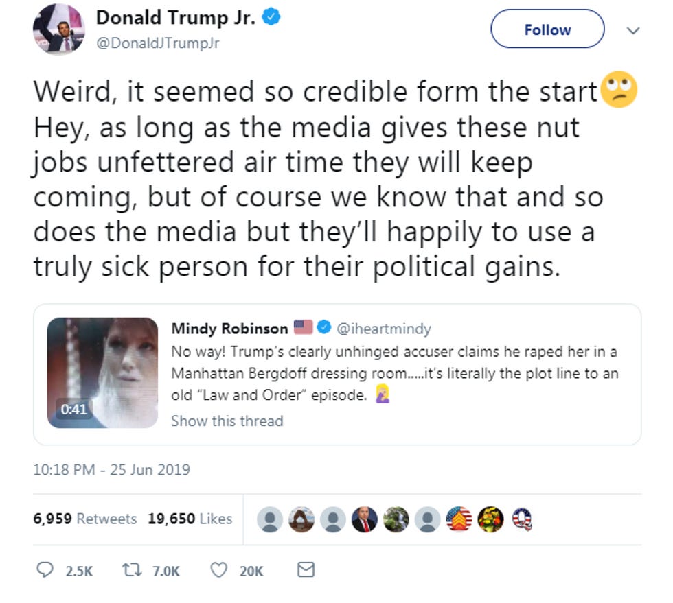 Donald Trump Jr. has taken to repeating a bizarre conspiracy theory that Carroll actually ripped her story from SVU, because some QAnon idiot on Twitter found an old Law and Order: SVU episode in which a man describes fulfilling rape fantasies in a Bergdorf Goodman dressing room.