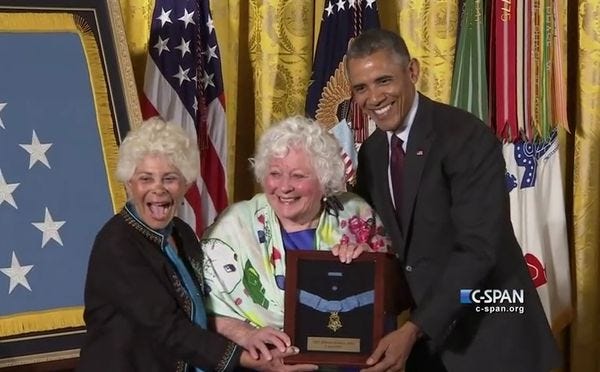 Watch the video of the ceremony and have yourself a good patriotic sniffle or two. The presentation of the Medal of Honor is always moving; seeing it awarded to two men whose heroism had to wait decades to be officially acknowledged makes it all the more so.