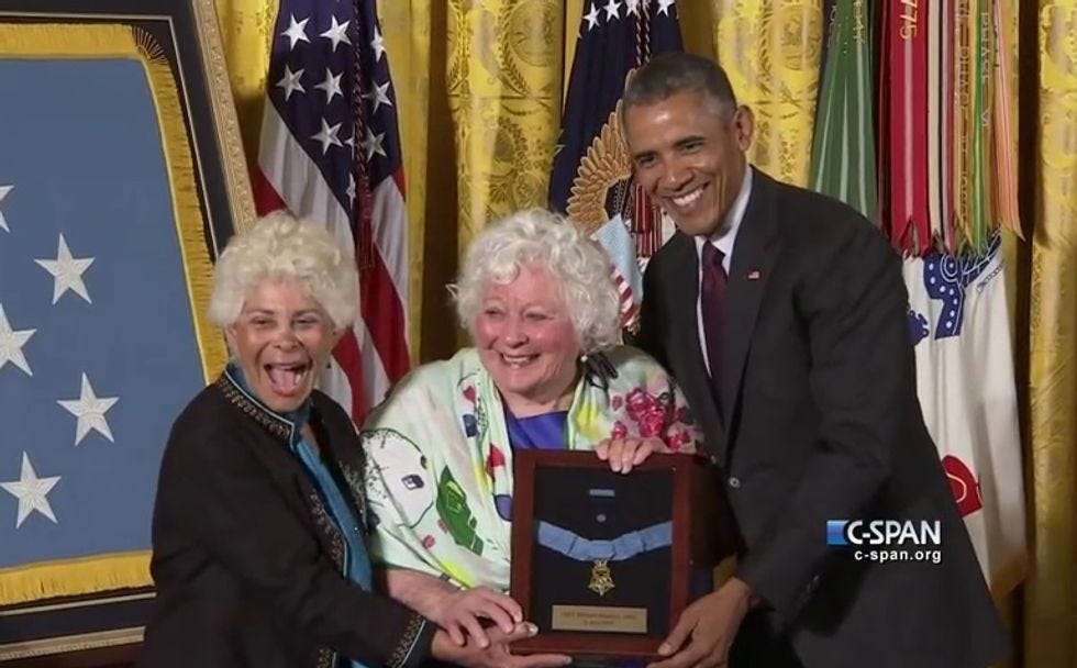 Two heroes of World War I were finally recognized Tuesday by President Obama at the White House; the president presented the Medal of Honor posthumously to Private Henry Johnson and to Sergeant William Shemin, whose heroism in battle was impressive, but who were, respectively, too black and too Jewish to be awarded the nation's highest military honor while they were still alive. We're looking forward to the inevitable complaint from Bryan Fischer that the medals were feminized or something.
