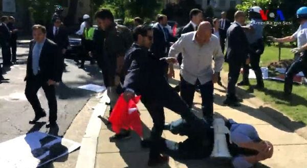 The attacks were carried out at the apparent direction of Erdogan, who sat in the back of his Mercedes and told an aide to go have the goons bust some heads.
