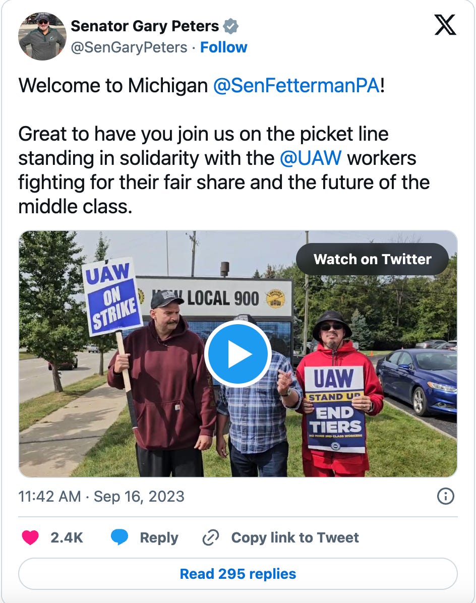 And Democratic Senator Gary Peters from Michigan was happy to welcome him, tweeting “Great to have you join us on the picket line standing in solidarity with the @UAW workers fighting for their fair share and the future of the middle class.”