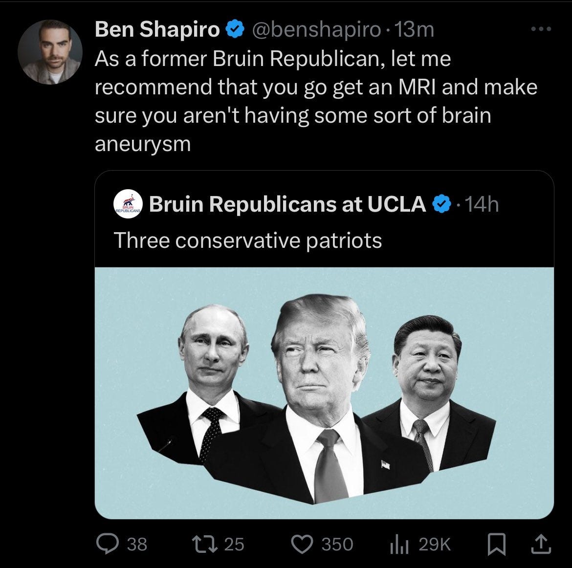 Update: In reply to quite a few skeptical comments, yes, “Bruin Republicans” is a real group at UCLA, notorious for having invited that jerk Milo Yiannopoulos to campus a few years back (he cancelled) and also a former member of the group was arrested for entering the Capitol on January 6, 2021.