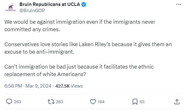 You might as well point out that the average Berliner of 1936 would have found nothing wrong with the tweet either. Speaking of, the Bruin Republicans account claimed Sunday — with another old racist saw — that the US is uniquely foolish about letting its whiteness be diluted, claiming that