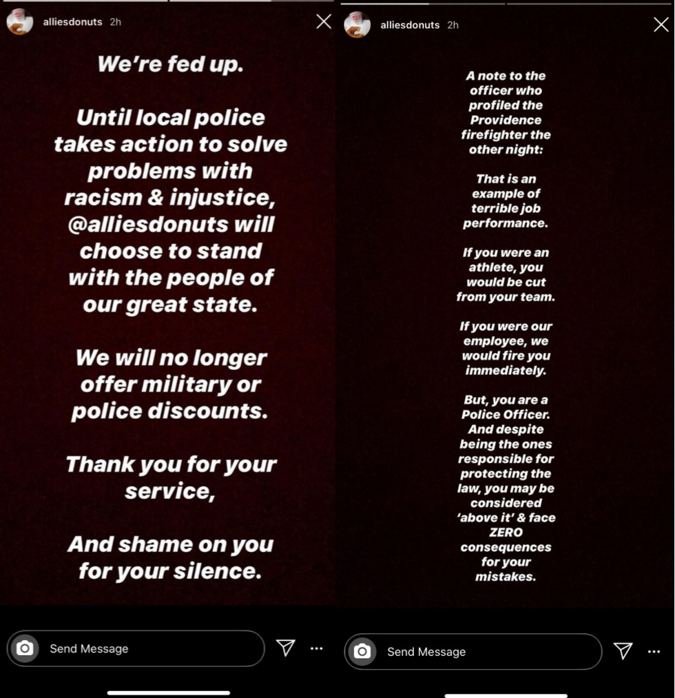 This weekend, Allie's Donuts, an iconic donut shop in North Kingstown, Rhode Island, announced on Instagram that it would no longer be giving out a special discount for cops or military personnel until the police get their act together. Which seems quite fair! It's actually kind of weird that cops get special donut discounts anyway, when you think about it.