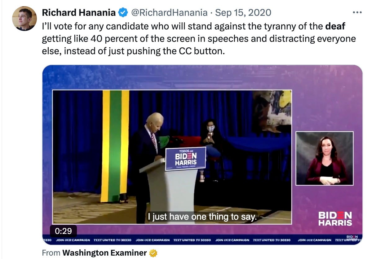 Hanania’s been mad about accommodations for deaf people for a while, tweeting about it repeatedly for years. Such as back in 2020: “I’ll vote for any candidate who will stand against the tyranny of the deaf getting like 40 percent of the screen in speeches and distracting everyone else, instead of just pushing the CC button.”