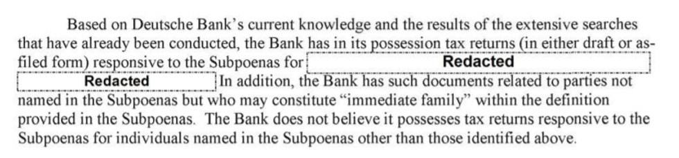 The subpoenas went to both Deutsche Bank and Capital One, but Cap One says it ain't got no tax returns, just financial docs. So whose taxes does Deutsche Bank have? Well ...