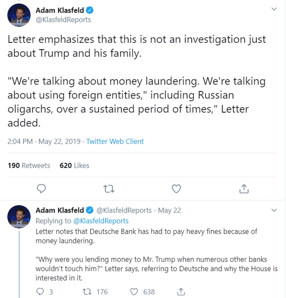 House counsel Doug Letter noted in court in May that these House investigations are about much more than Donald Trump. Here, from reporter Adam Klasfeld's live tweeting of the oral arguments in the Southern District of New York: