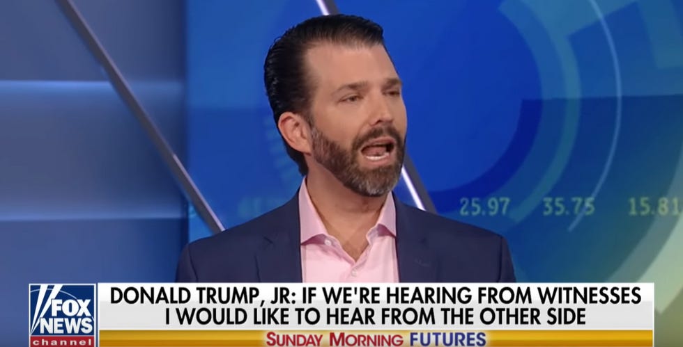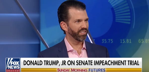 Any-hoo, Junior went on the "Sunday Morning Futures" TV talk-time program on the Fox Business, and he had some fightin' words for senators who might violate his criminal father's trust by voting for witnesses in the Senate trial, if they don't want to include completely relevant witnesses like Joe Biden and Hunter Biden, who don't have shit to do with his father's crimes except for how they are victims of them: