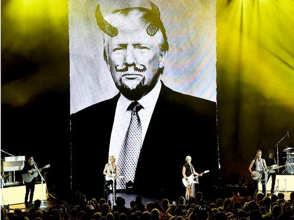 While performing at a concert in Cincinnati, Ohio, this weekend, the all-female band performed in front of a photo of [Donald Trump] with drawn-on horns and facial hair.