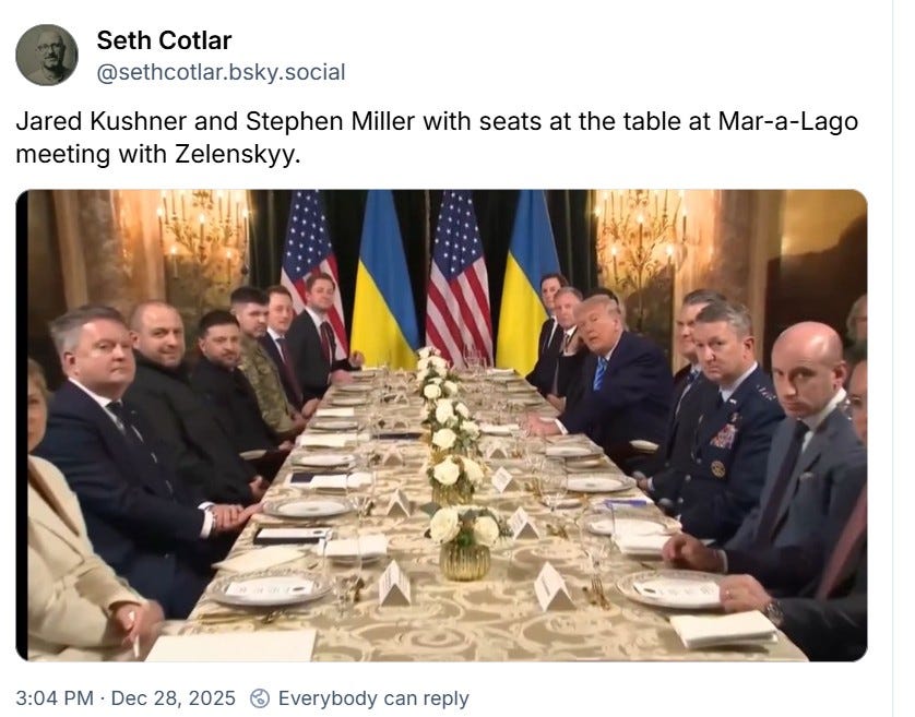 So then it was on to Mar-a-Lago, where the Ukrainian contingent found itself sitting across a negotiating table from dollar-store Nosferatu Stephen Miller and luckiest dipshit alive Jared Kushner, which must have inspired all sorts of confidence in how things were going to go.