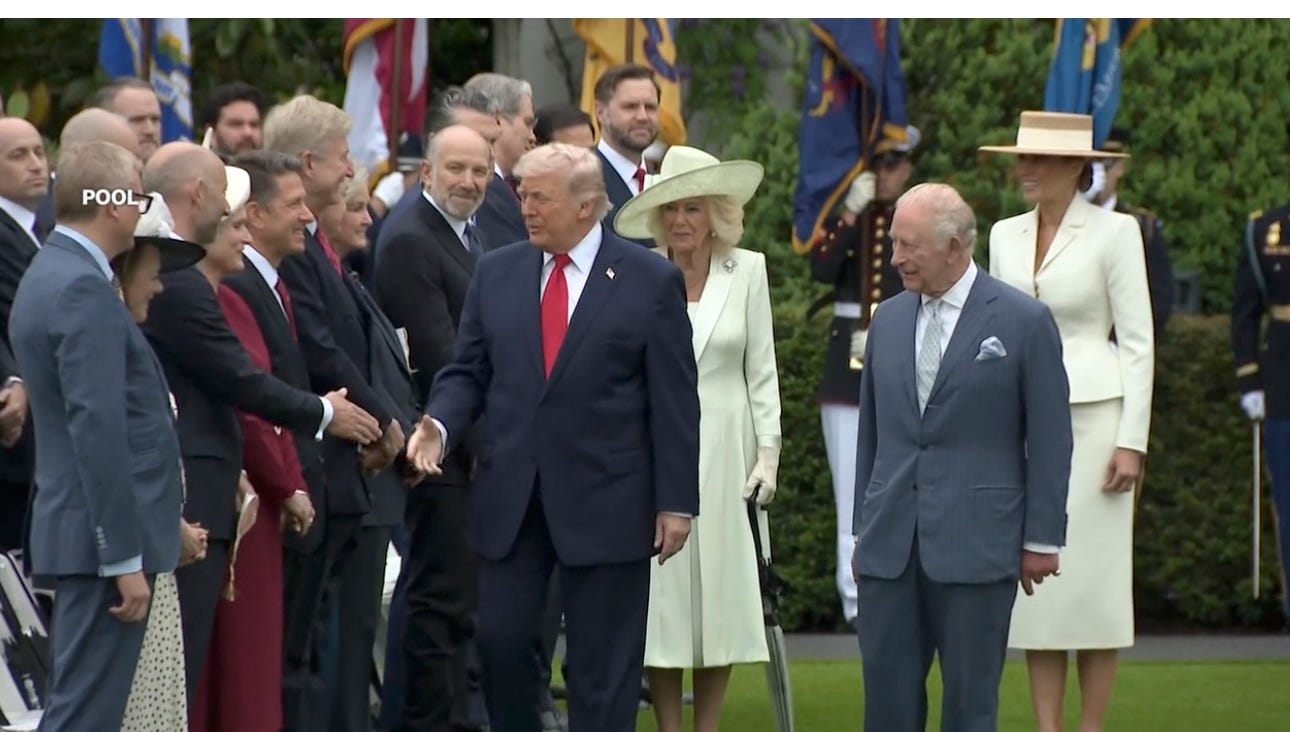 Watch and hear the honkety honkety tooty toot from Monday, following the couples’ arrival from Joint Base Andrews, and before attending a garden party hosted by the British Embassy, with a guest list that included “Treasury Secretary Scott Bessent, British Olympic diver Tom Daley, Rep. Nancy Pelosi and Sen. Ted Cruz, among others” (what a bunch!). Behold the rare scene of Trump standing up straight, after assertively gripping poor Charles’s tender water-colouring hand!