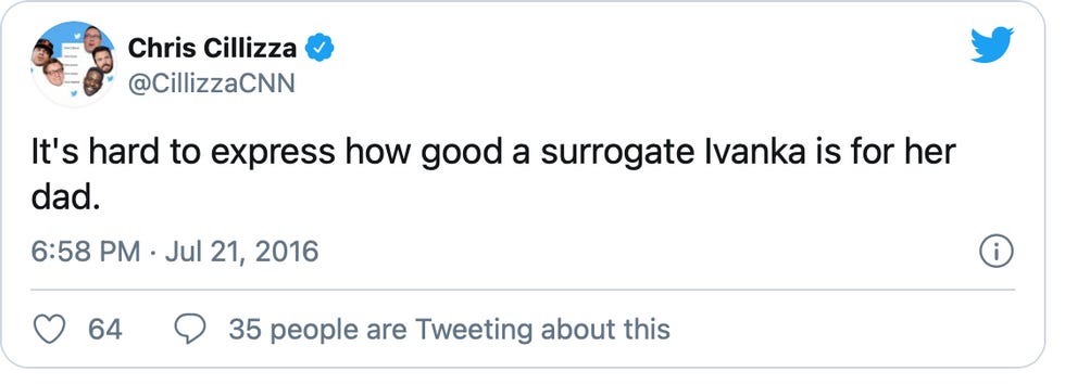 That's right. Ivanka Trump's mind, a fractured fairy tale theater, has convinced itself that whatever it is she does qualifies as a “political career." She also believe it holds promise, even as her mob-inciting father is run out of town on a rail.
