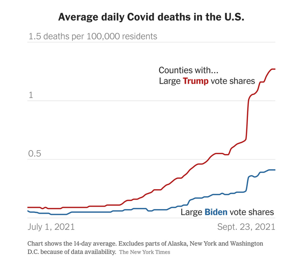 The New York Times today published data showing that the daily number of COVID deaths tends to be significantly higher in counties that voted for Trump than counties that voted for Biden.