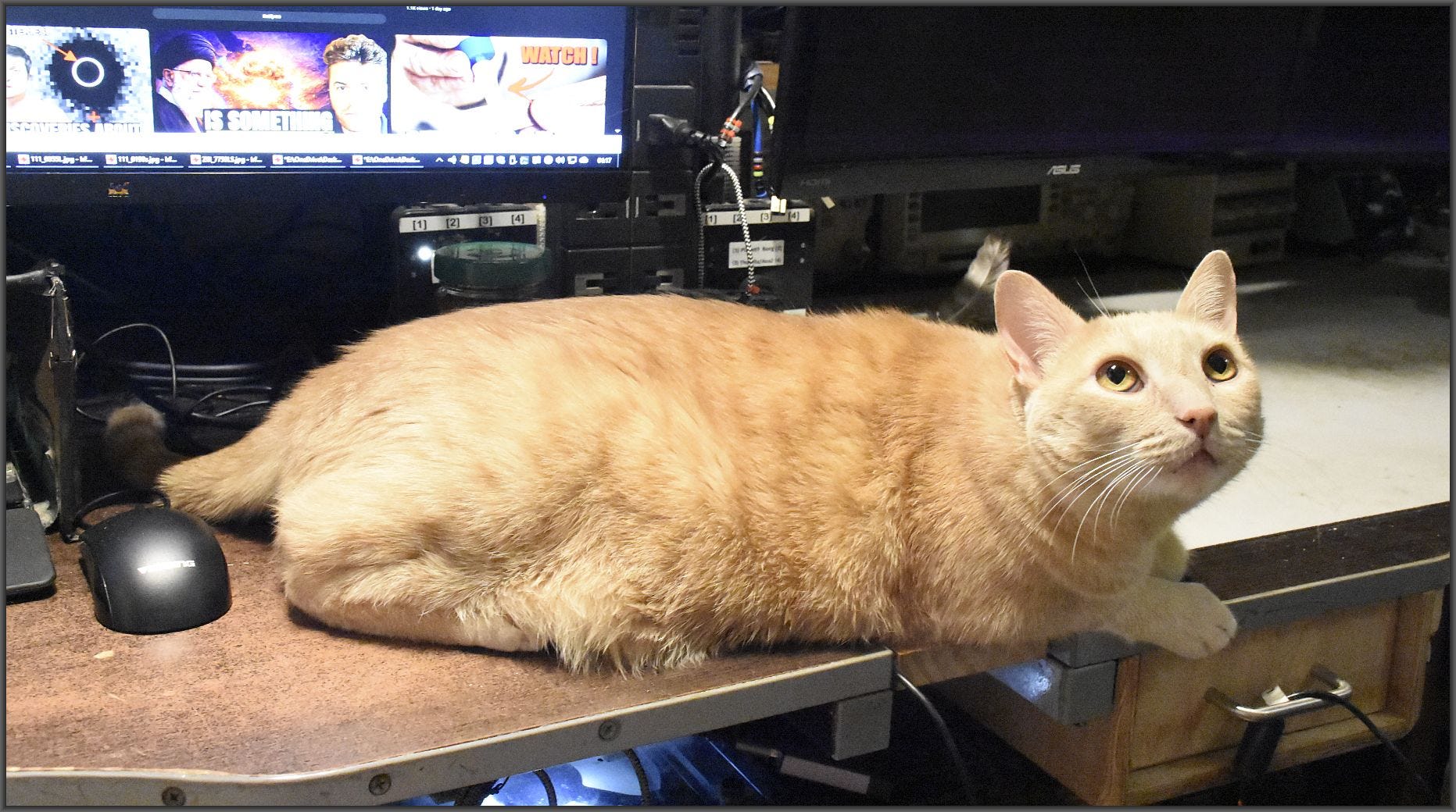 Simba looking up at my flailing hand. Otherwise, he just settles his head over the edge of the desktop like a Salvador Dali melted clock which makes for a rather uninteresting image. The Crew are usually so relaxed.