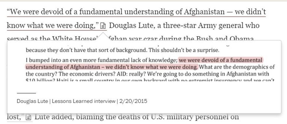 "We were devoid of a fundamental understanding of Afghanistan — we didn't know what we were doing," Douglas Lute, a three-star Army general who served as the White House's Afghan war czar during the Bush and Obama administrations, told government interviewers in 2015. He added: "What are we trying to do here? We didn't have the foggiest notion of what we were undertaking."