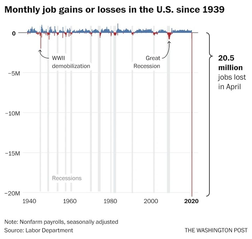 For comparison, here's a chart from the Washington Post of historic US recessions since 1939 and employment rates. That cliff at the right side should be labeled "You Are Here."