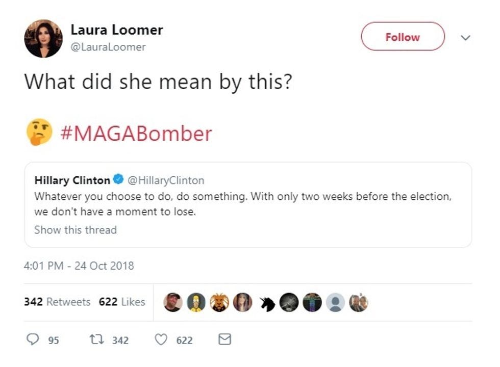 Loomer may even have found the SMOKING DUMB: a Tweet by Hillary Clinton that is almost certainly a signal to the sleeper cells to begin their attacks!!!!