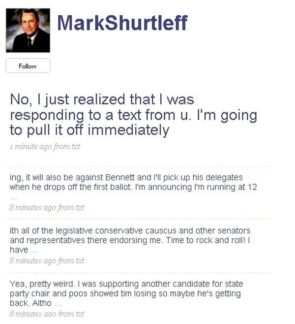 Mark Shurtleff is the Attorney General of Utah. He will challenge Sen. Bob Bennett in the 2010 Republican primary. He Twittered this news last night, mistakenly, and now he looks foolish. "Time to rock and roll!" You just can't vote for anyone who writes that. "poos showed tim losing." OMG Twitter. Jesus. [ The Hill via Gawker ]