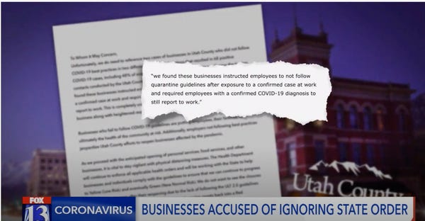 Why should we trust these businesses to do the right thing when they willingly violated guidelines and demanded that sick employees come to work and drip coronavirus all over whatever it is they do at the businesses Utah County executives refuse to name?