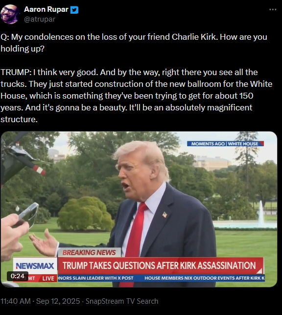 Well, that was fast. Looks like Charlie Kirk got the old Ivana Trump treatment from Trump, while he and his minions cynically use the tragic event to excuse further fascist moves, like Speaker Mike Johnson whining on Fox News Sunday that people who oppose fascism call them mean names.