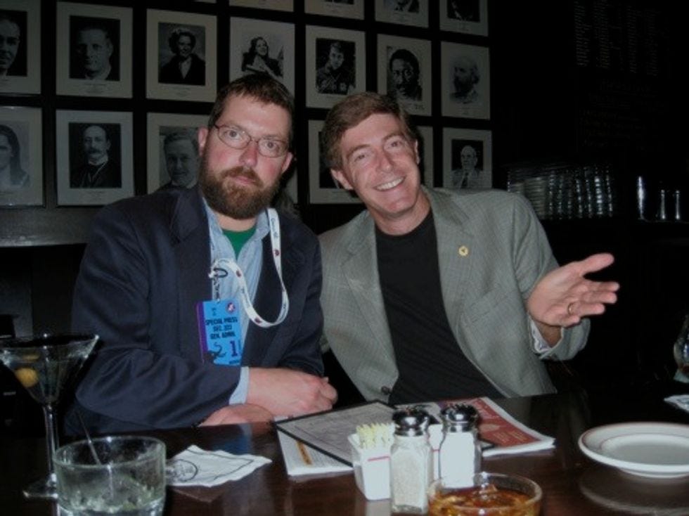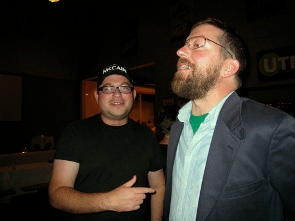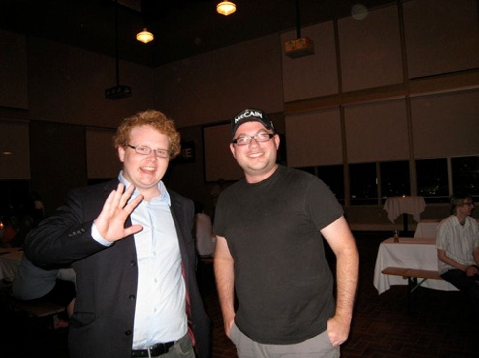 Who's that jackass in the McCain cap? Why, that's famous Washington blogger-writer Matthew Yglesias. First we tried to get theUTNEeditors to introduce themselves to "Andrew Sullivan," but nobody had the spine. Then we tried to get Matt to write some "constitutional crisis" thing about how Ron Paul gets the nomination if John McCain accepts by video because video is not in the Constitution, but Yglesias instead agreed to plant the story to Sullivan's site, via Sullivan's hapless assistant.