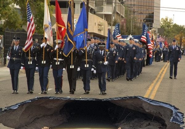 As everyone knows, Donald Trump says he loves no one more than Our Great Military, unless it is Our Great Veterans. He is VERY GOOD at saying he loves Our Great Veterans, and insisting he's made everything much better for them. To demonstrate how much he loves the troops and the vets, Trump has managed not to visit any soldiers deployed in war zones, couldn't be bothered to go to Arlington on Veterans Day, and also skipped a visit to an American WW I cemetery in France because it was raining.