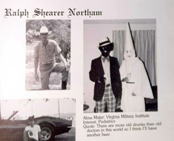 Seriously, we talked about assholes in blackface just last week. We have to do it again? That's how you want to kick off Black History Month? Fine, then let's jump right to the point, shall we? Virginia Governor Ralph Northam needs to resign immediately. He admitted Friday to having appeared in a racist photo from his 1984 medical school yearbook that shows a man in blackface and another in a Ku Klux Klan robe.
