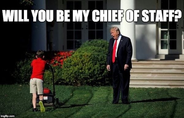 But it wasn't meant to be. Ayers begged off by saying he needs to move his family back to Georgia by spring, so, much as he would like to, he won't be able to roll around that flaming bag of dogshit with y'all. Unwilling to accept an interim chief of staff, Trump was forced to kiss the golden boy goodbye. SAD.