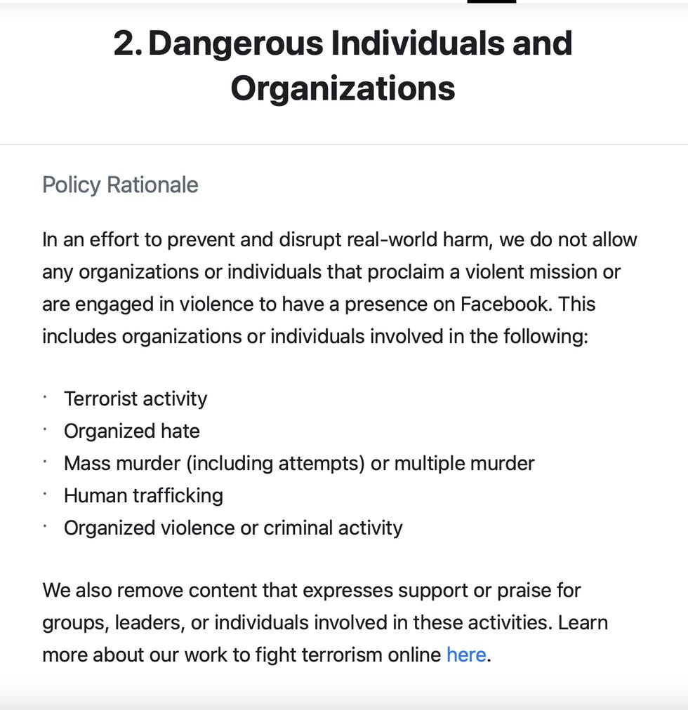 In an effort to prevent and disrupt real-world harm, we do not allow any organizations or individuals that proclaim a violent mission or are engaged in violence to have a presence on Facebook. This includes organizations or individuals involved in the following: