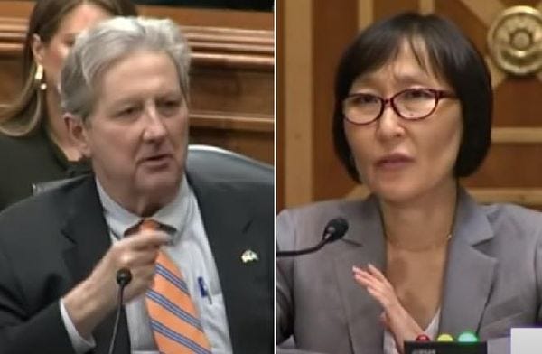 And that's how Sen. John Neely Kennedy (R-Louisiana), the Oxford-educated dude who pretends he's just a corn-pone shitkicker, came to ask Omarova Thursday whether she is now or has ever been a communist, and whether she ever hid any microfilms of secret H-bomb plans in Alger Hiss's pumpkin patch.