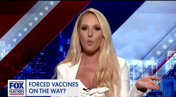 The inexplicably employed Tomi Lahren was probably crowing about the Johnson & Johnson recall after she showed her ass last night about vaccines. During a Fox Nation segment, Lahren decried “forced vaccinations," which is what an entitled white woman would consider any minor inconvenience she might experience because she refused the COVID-19 vaccine. Conservatives used to say that the law is just because rich and poor people alike are forbidden from sleeping under bridges. Now, they believe the law is unjust if they can't go on a cruise without proof of vaccination.