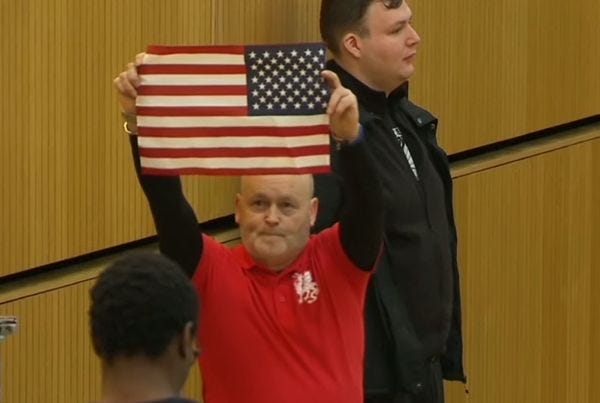 The police still hadn't arrived after 10 minutes or so, so one of the protesters took his backwards American flag to hold up and show to Khan: