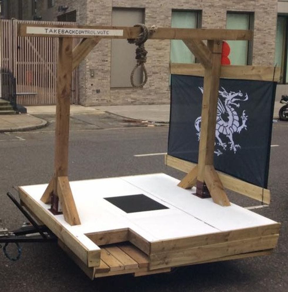 Russell and his fellow dipwads showed up ready to "arrest" Khan for a variety of crimes they'd made up, accusing him of collaborating with terrorists and insisting Khan somehow crimed by calling for Donald Trump to cancel his trip to the UK -- even though everyone knows that was Barack Obama's fault . Russell also said that Khan had no business talking about global politics like a globalist, because that's above his pay grade: "He should keep his nose out of state affairs and look out for what’s going on in London," said the alleged hominid outside the meeting hall, where he parked his pretend gallows: