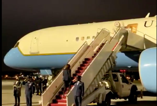 Kamala Harris refuses to salute the honor guard at the steps of the aircraft. It is a clear demonstration of her dislike for those in uniform, both law-enforcement and military.