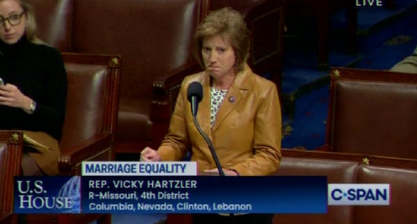 Y'all. The Oscar for "Most Goodest Trying To Cry Because Gay People Who Fucking Hate You And Don't Care What Your Bigot Ass Thinks Are Allowed To Get Married" DOES NOT GO to Vicky Hartzler of Missouri.