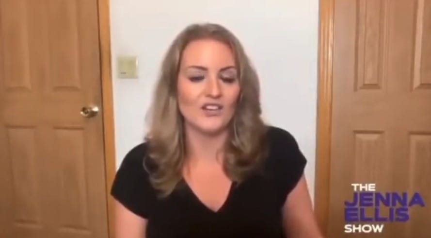 For a reminder of what extremist homophobic garbage Jenna Ellis really is, you can google her calling Pete and Chasten Buttigieg “sexual perverts” who treat their children like “commodities,” or you can watch this video of her saying, like any Westboro Baptist Church protester, that the victims of the Pulse mass shooting in Orlando are in hell: