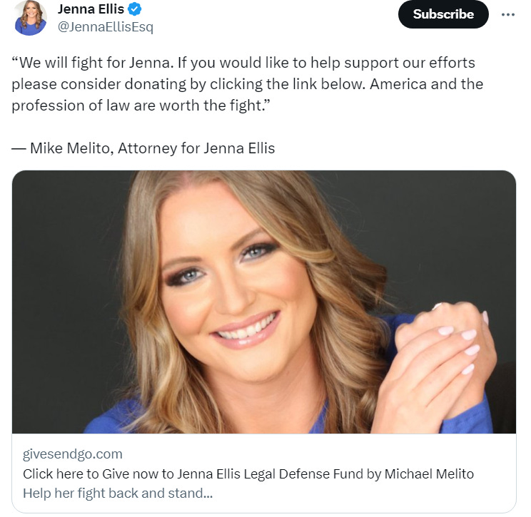 Just going to take a second to point out that Mike Melito, Attorney for Jenna Ellis, is asking people to donate to a fund to help pay for legal fees for the Attorney for Jenna Ellis, Mike Melito.