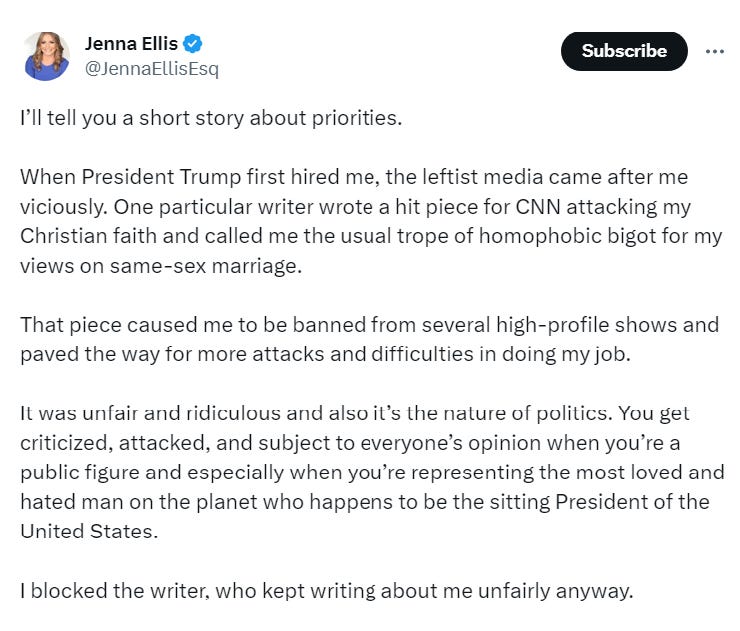 Yesterday she was tweeting out tacky inspirational messages that look like they came from the Live, Laugh, Love collection in the home decor section of hell run by Joanna Gaines. Today she’s tweeting out tacky inspirational stories that, in typical fundamentalist Christian white shitbag fashion, portray her as the heroic Bible princess, most virtuous of all. Would you like to hear about the good deed Jenna Ellis did, which is why she is ultimately deserving of your support? Would you? Would you?