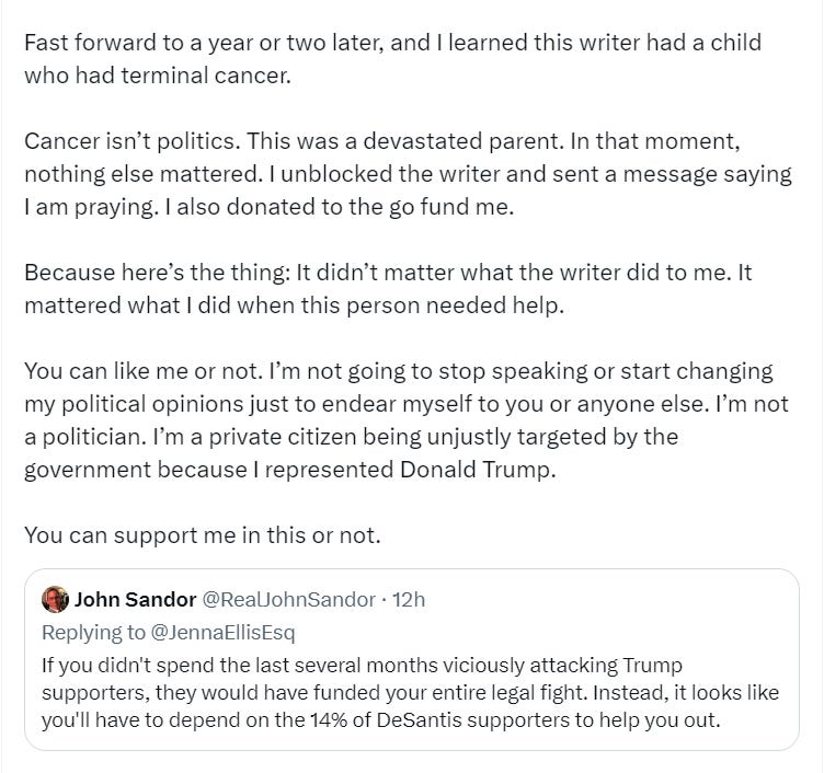 Cancer isn’t politics. This was a devastated parent. In that moment, nothing else mattered. I unblocked the writer and sent a message saying I am praying. I also donated to the go fund me.