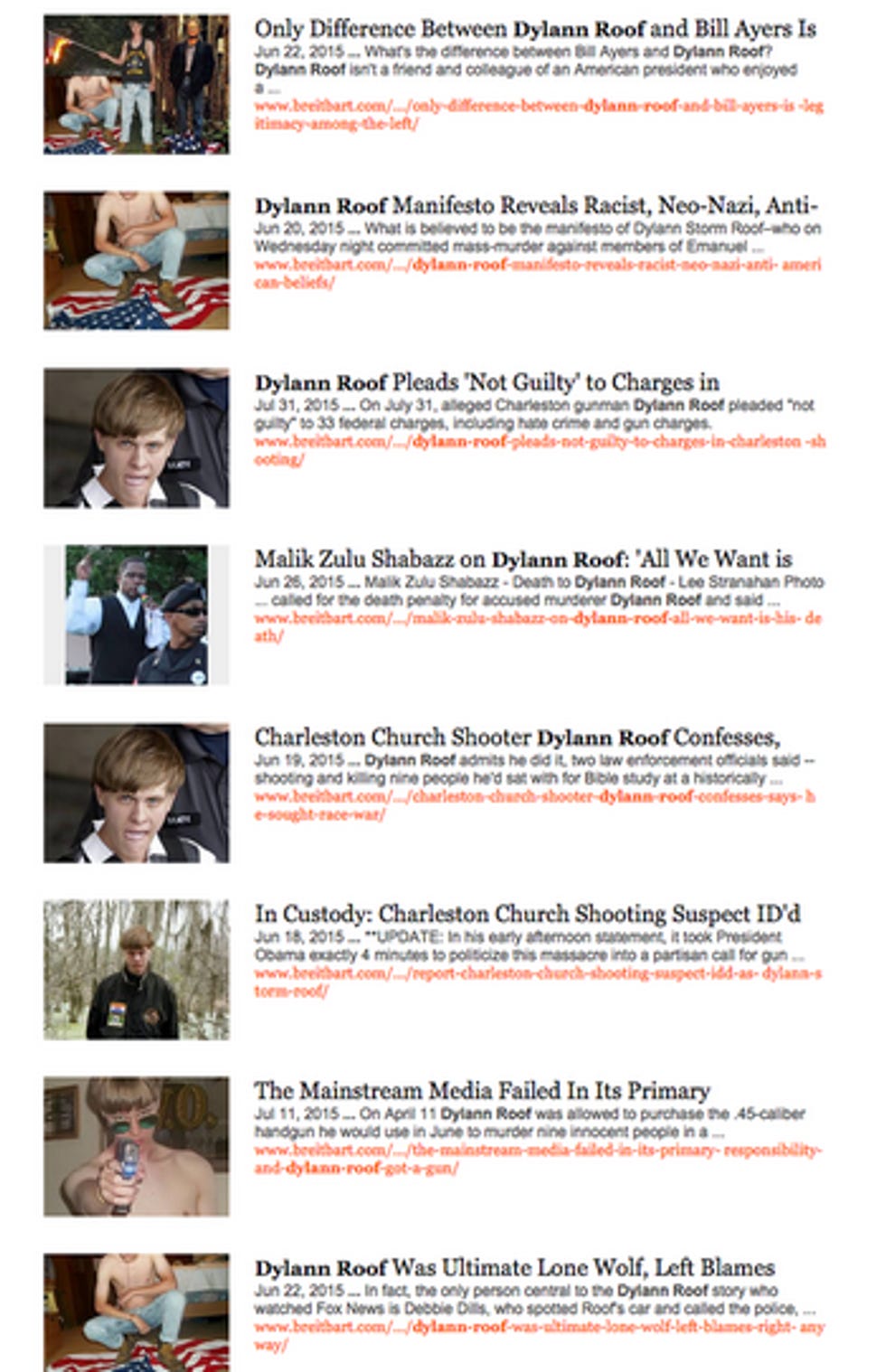 Now, HuffPost reporter Elise Foley tweeted this picture of a bunch of OTHER Breitbart headlines about the mass shooting committed by known white person Dylann Storm Roof, noting that not a single one of them mentioned Roof's race, but that is unfair, and she should not do reverse racism to Nolte and his Breitbart jerk-off circle buddies like that: