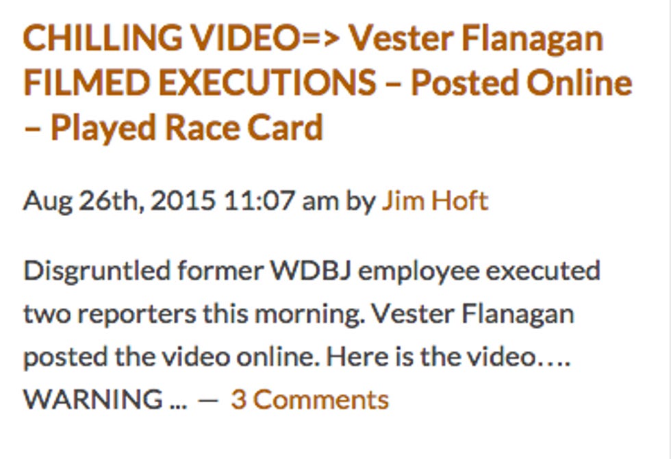 By now, you've heard the gruesome news, unless you work at a bar and you're just now getting up. A disgruntled former employee of WDBJ-TV in Roanoke allegedly carried out a plan to murder two of his former colleagues, Alison Parker and Adam Ward, on camera as Parker was doing a fluff interview about tourism. Suspected gunman, Vester Lee Flanagan II (or Bryce Williams, when he was on camera), posted his crimes on social media, and then he shot himself. He's reportedly in critical condition. [NOTE: Police report he died at around 1:30 PM ET.]
