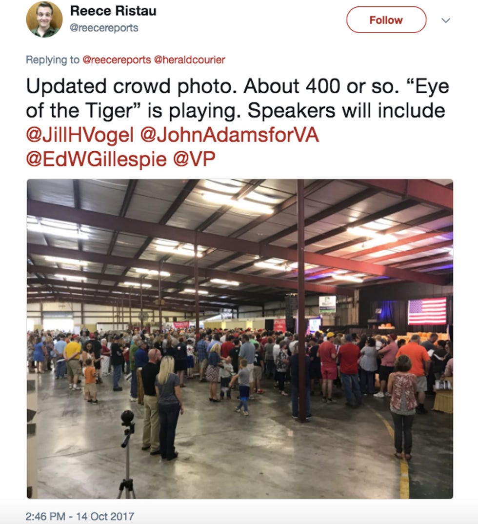 "President Trump and I need Ed Gillespie to be the next governor of Virginia," Pence announced yesterday to a mostly empty room in conservative Washington County.